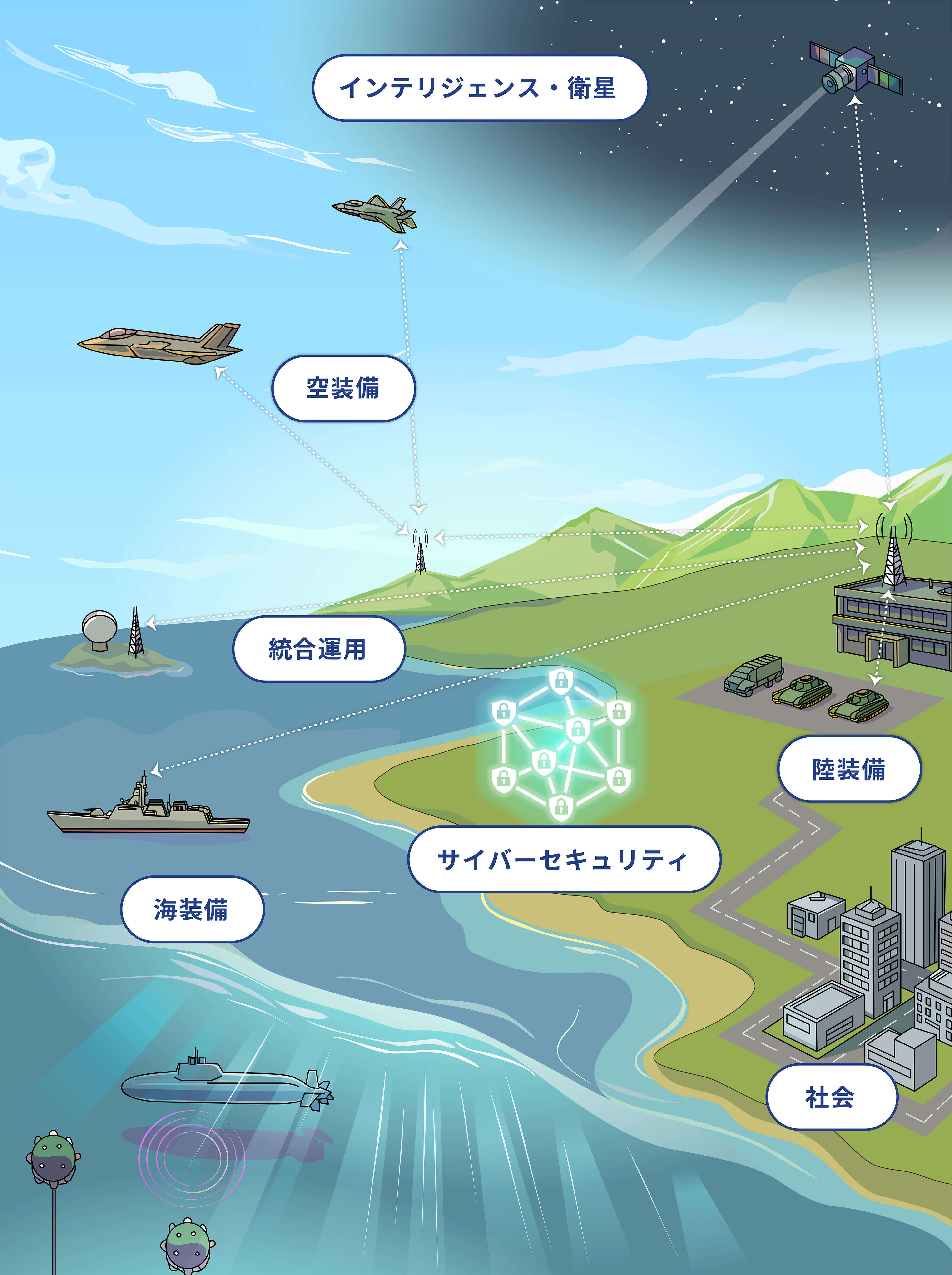 防衛を核とした安全保障分野においてサイバー攻撃の脅威や、お客様の運用に精通したSE力と最新のサイバーセキュリティ技術をもって、お客様の任務遂行に必要となるサイバー空間の安全確保を実現するソリューションを提供しています。